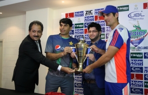 Abu Dhabi–October 11, 2015: The coveted UBL presents Haier Mobile Cup Test Series trophy was unveiled today by the Pakistan and England skippers, Misbah-ul-Haq and Alastair Cook in the presence...