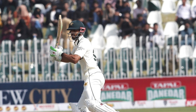 At stumps, Saud Shakeel returned undefeated on 42 off 105 balls, striking three boundaries, while Salman Ali Agha was not out on 10 off 25 balls, which included one boundary.