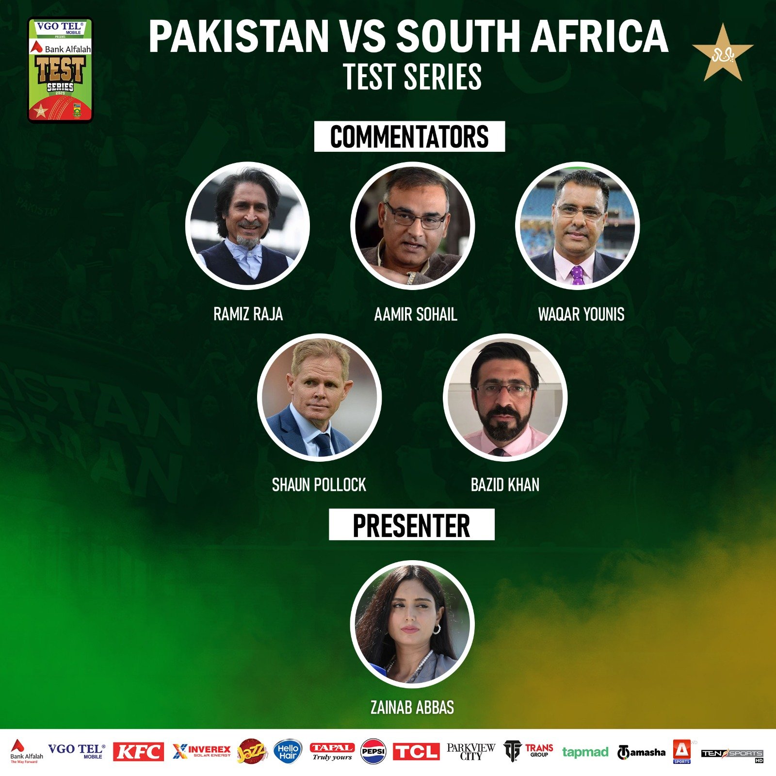 Pollock, who visited Pakistan in 1997 and 2003 and featured in five Tests here, will be joined by former Pakistan Test captains Aamir Sohail, Ramiz Raja, Waqar Younis and former Test cricketer Bazid Khan.