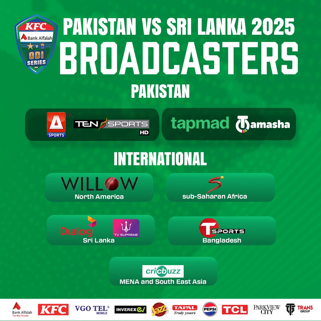 The ODI series will be broadcast live on A-Sports and Ten Sports in Pakistan, while it will be live-streamed on Tapmad and Tamasha across the country. Viewers around the world can watch the action live on Willow TV (North America), Super Sport (sub-Saharan Africa), Supreme TV and Dialog TV (Sri Lanka), TSports (Bangladesh) and Cricbuzz (Middle-East and North Africa and South East Asia).