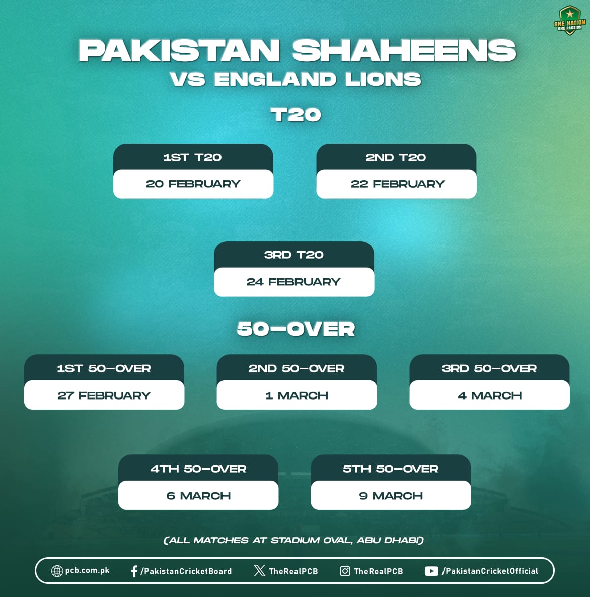 All the matches are set to take place at the Stadium Oval in Abu Dhabi. The Pakistan Shaheens squad will take part in a seven-day training camp from 11-17 February in Karachi before departing for United Arab Emirates.