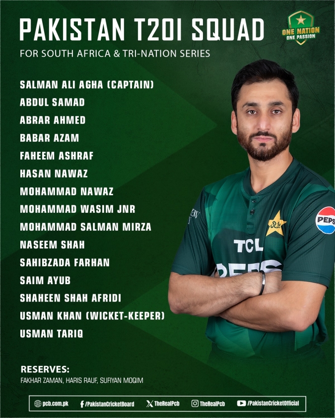 Lahore, 23 October 2025: The National Selection Committee has named a 15-member squad for the T20I series against South Africa and the T20I tri-series involving Sri Lanka and Zimbabwe, while a 16-member squad has been announced for the ODI series against South Africa and Sri Lanka.