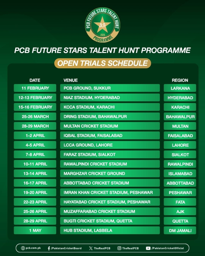A panel of former Test cricketers comprising PCB Director High Performance Aqib Javed, National Cricket Academy coaches Misbah-ul-Haq and Abdul Razzaq will travel to the venues to conduct the trials from 11 February. The trials in will begin from PCB Ground in Sukkur, where players from Larkana Region can take part.