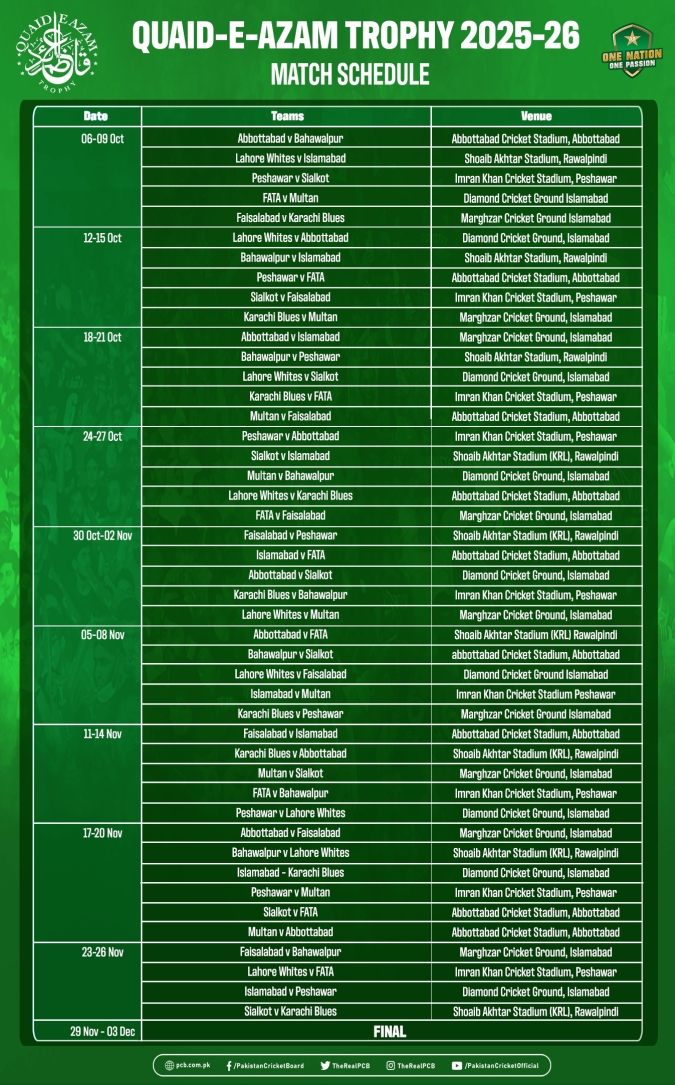 Lahore, 5 October 2025: The 68th edition of the Quaid-e-Azam Trophy will begin on Monday, 6 October in four cities and across five venues as 10 regional teams including defending champions Sialkot look to fight out for the red-ball glory in Pakistan.