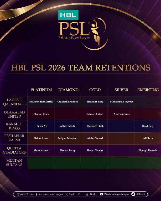 Lahore, 4 February 2026: Six franchises including defending champions Lahore Qalandars have unveiled their retentions for the HBL PSL season 11, while Multan Sultans have not retained any players from their previous squad, the Pakistan Cricket Board confirmed on Wednesday.