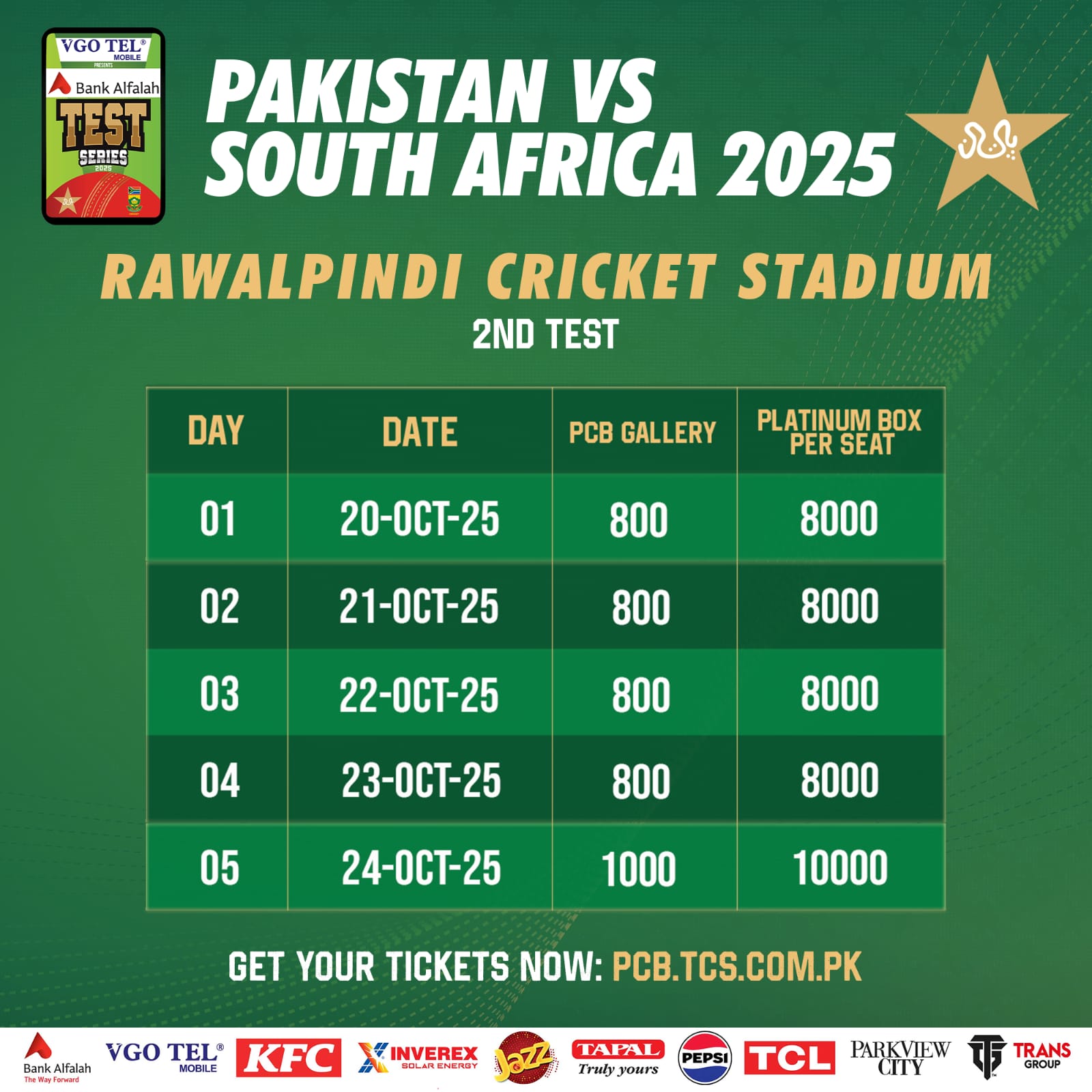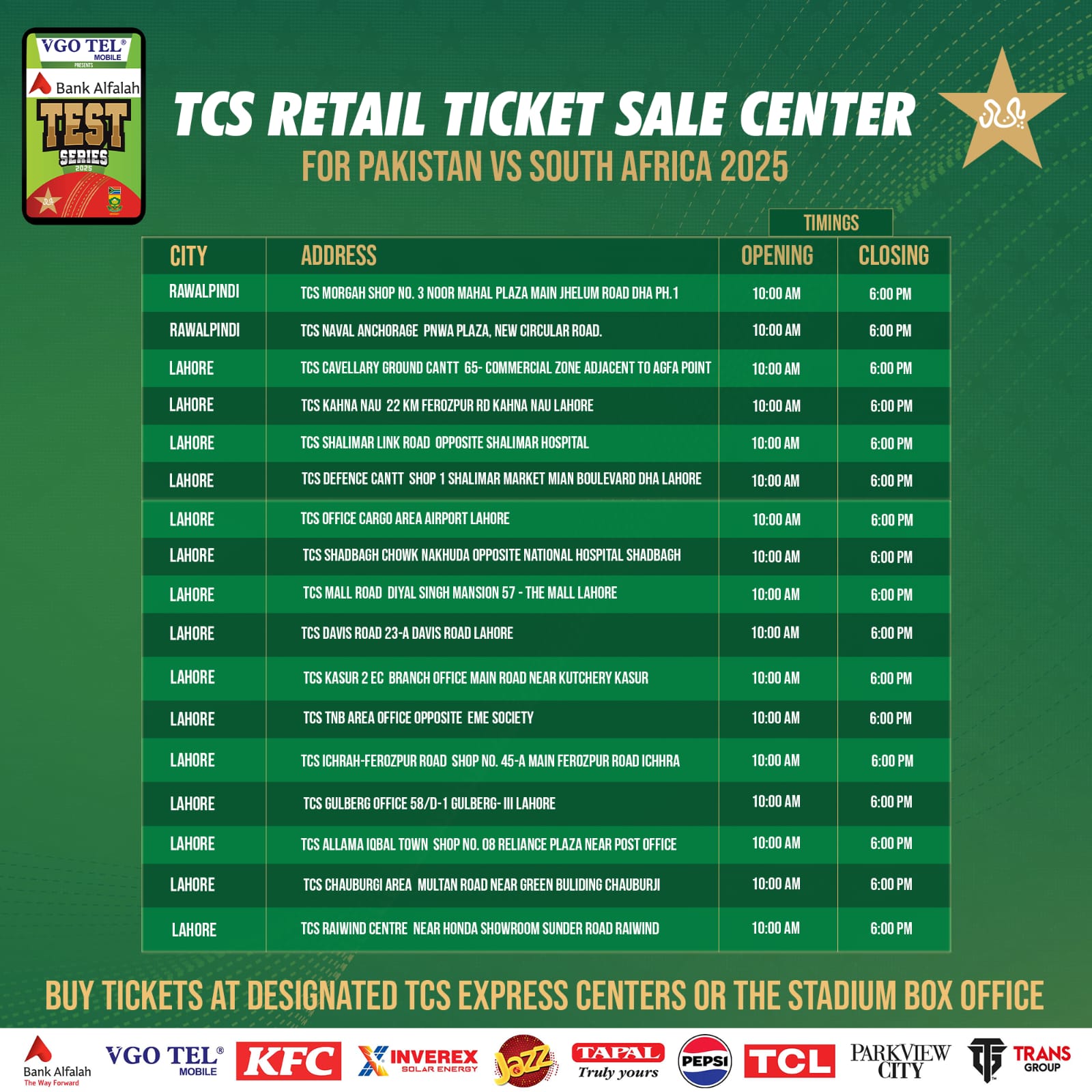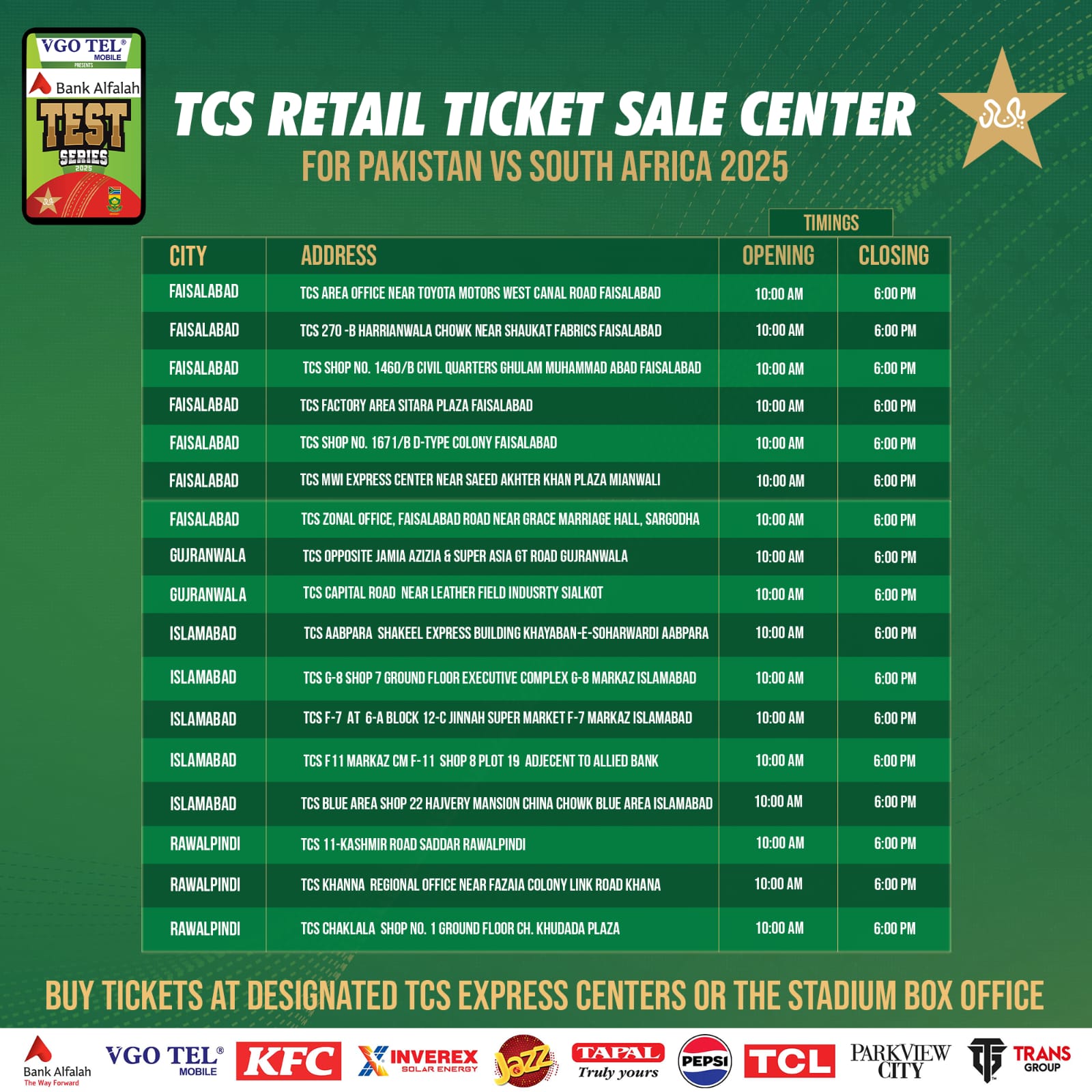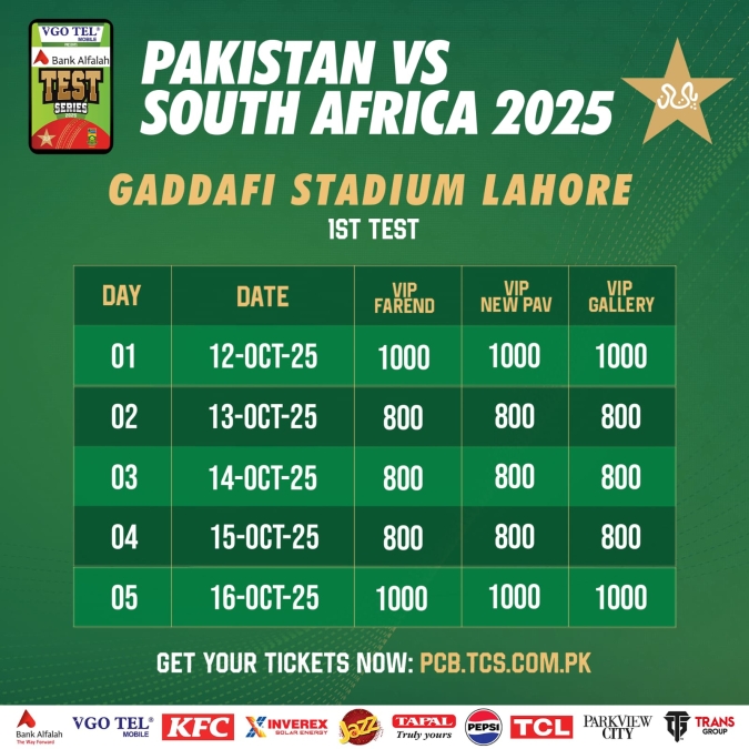 Lahore, 7 October 2025: The tickets for the two-Test match series between Pakistan and South Africa will go on sale later today from 5pm. The online tickets will be available here, while physical tickets for the Test matches will be available at TCS Express Centres from Thursday, 8 October (infographic attached).